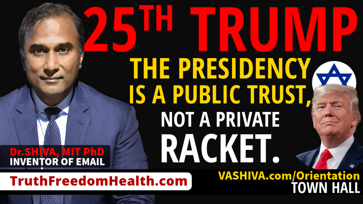 In this presentation, Dr.SHIVA Ayyadurai, MIT PhD, Inventor of Email, and Independent Candidate for President of the United States and U.S. Senate, makes it clear: the Presidency is a public trust, not a private racket. When that trust is abused, We the People must demand removal. Dr.SHIVA calls on the Vice President, the Cabinet, and Congress to invoke Section 4 of the 25th Amendment to remove Donald J. Trump, and walks through the petition and Articles of Betrayal documenting how Trump’s record has advanced war, censorship, corruption, elite criminal protection, and rule by deceit, benefiting the Swarm and foreign influence networks over the American people. The petition also lays out what real leadership and a real movement look like: Support Shiva4Senate to grow the movement that provides the necessary three-part infrastructure to change the world: Systems Science theory, a global community, and organized action. This is not Left versus Right. This is Truth versus lies, Freedom versus control, Health versus poison. Sign and share the petition here: https://shiva4senate.com/25th-Trump/. Full Blog Post: https://vashiva.com/dr-shiva-live-25th-trump-the-presidency-is-a-public-trust-not-a-private-racket/
